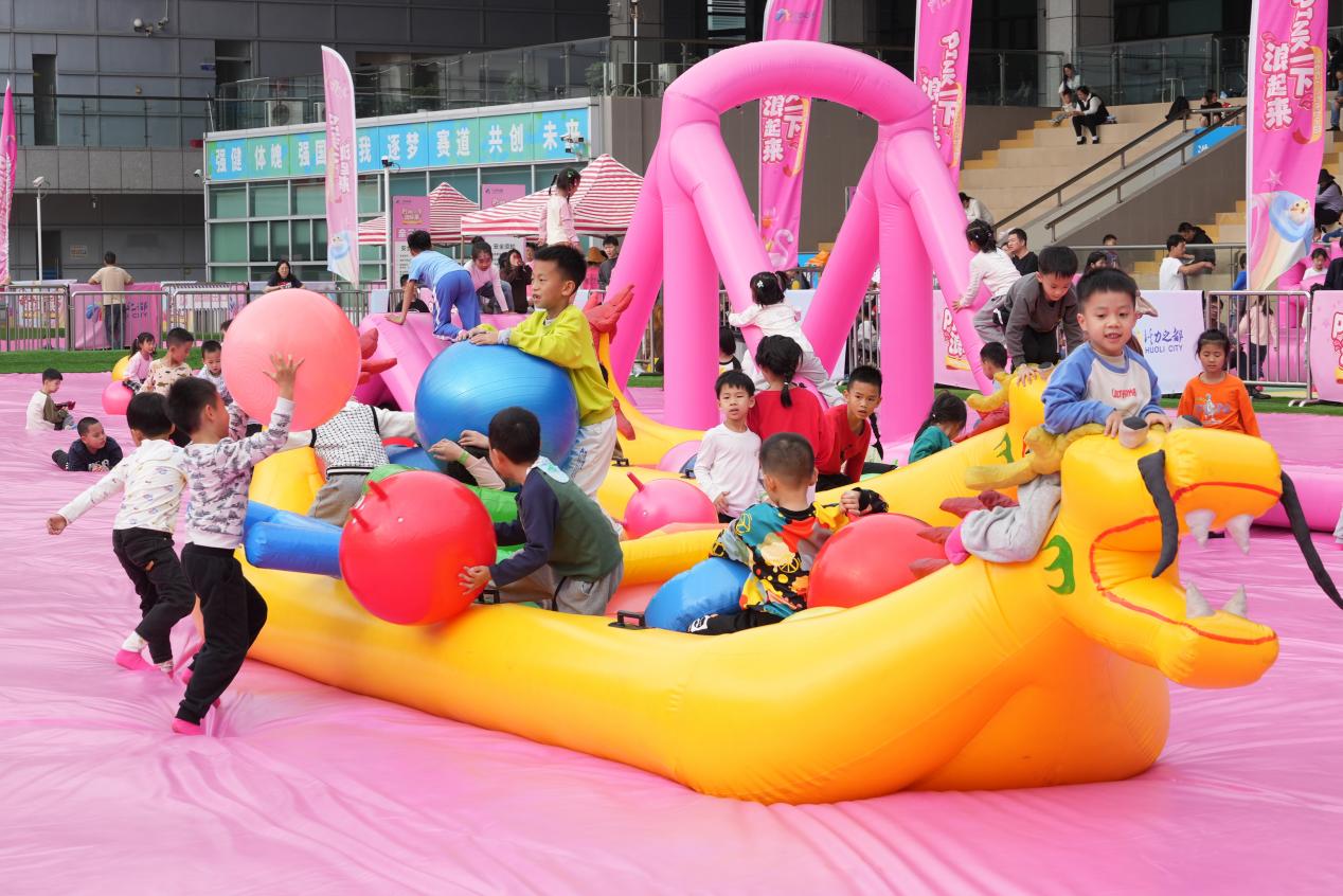 “PINK一下,浪起来”活力之都浮动乐园位于宝体的宝安游泳场内,项目依托宝安游泳场室外水上运动场地资源,利用室外公共游泳池的运营淡季,将场馆打造成泳池浮动式主题游乐场,成功将露天游泳池的运营周期从半年延伸至全年,让室外游泳场变得一年四季都好玩,也成为了深圳首个浮动乐园。