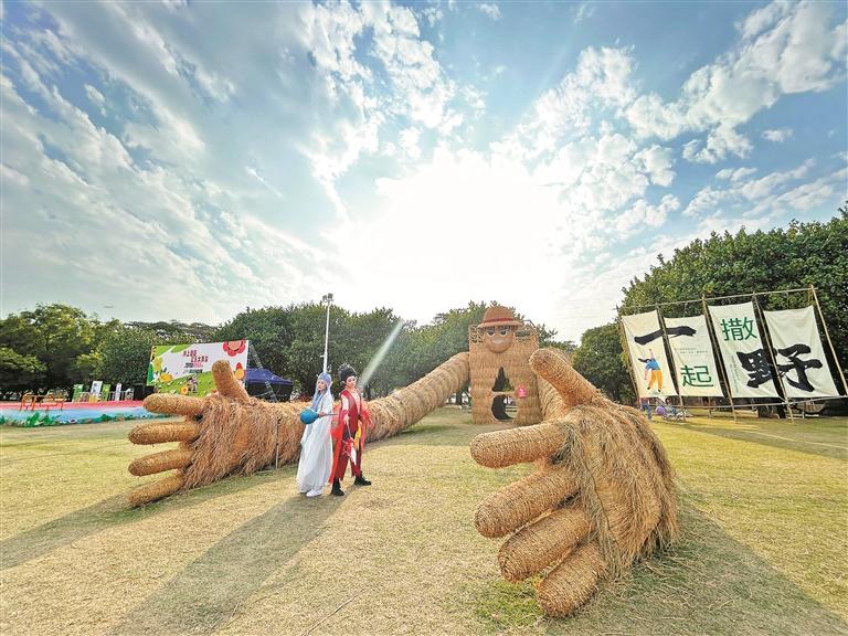 走进海上田园,首先映入眼帘的是傲然伫立的巨型大猩猩稻草人,它仿佛守护着这片充满创意与梦想的稻草王国。与这位庞然大物合影,游客仿佛瞬间穿越至好莱坞大片的现场,感受到那份震撼与惊喜。此外,憨态可掬的黑耳熊、风度翩翩的草帽小哥,以及破土而出的巨型手掌稻草人也给游客留下了深刻印象。