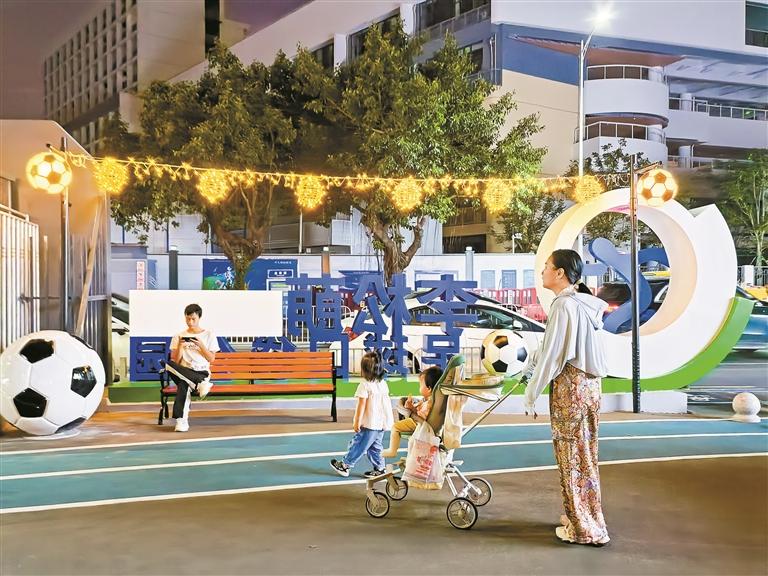 此前,社区居民尤其是附近住户因缺乏就近运动场所,要到很远的场所去健身。如今,小型活动场地与颗粒橡胶地面构成的安全空间,成了孩子们嬉戏的乐园。户外长椅与绿植环绕的休憩区,让老年居民多了晨练闲聊的去处。清晨,老人沿步道散步晨练,呼吸草木清香;午后,孩童在草坪上追逐嬉闹,欢呼声此起彼伏;傍晚,亲子家庭围坐长椅闲聊,足球造型路灯亮起暖光,勾勒出温馨邻里图景。“这里不仅环境变好了,带孙子也有地方了,现在下楼就能来这里玩、在草坪上坐,社区把闲置地利用起来,真是为咱们老百姓办了实事!”家住隔壁楼栋的陈阿姨看着孙辈在这里开心玩耍时,言语间难掩喜悦,她忍不住为家门口的“新地标”竖起大拇指。