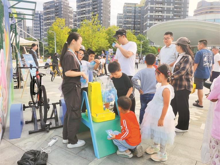 广场中央,“自在光明”“码住光明”“足够光明”三大主题互动区人头攒动。孩子们骑着充气小马跨越障碍,笑声不断;足球射门区前,年轻人跃跃欲试,一脚劲射命中目标,赢得一片喝彩;自行车体验区排起长队,市民在“蜗速冲刺”“双轮竞技场”等游戏中挑战自我,完成任务后兴高采烈地前往市集兑换奖品。