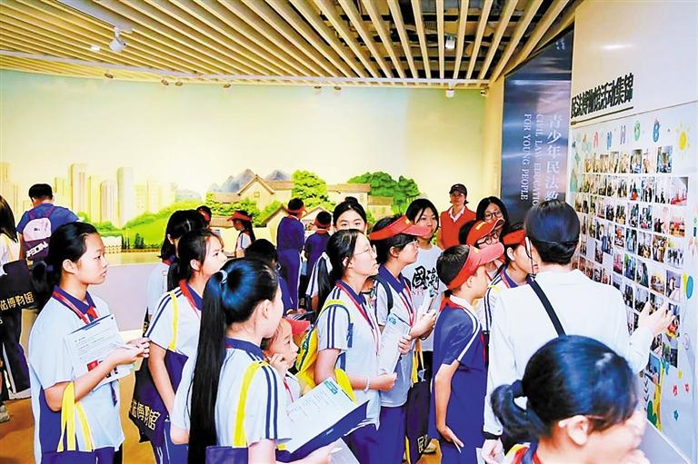 讲解员带领普法小使者参观民法博物馆。