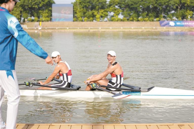 11月7日,十五运会宝安重点冲金选手倪旭林与搭档聂毅德亮相赛艇男子双人双桨预赛,二人最终以4分37秒90的成绩获得小组第一。倪旭林和聂毅德同时是预赛成绩排名第一的组合,他们将在8日上午举行的半决赛中,位列第一小组第3道出场。