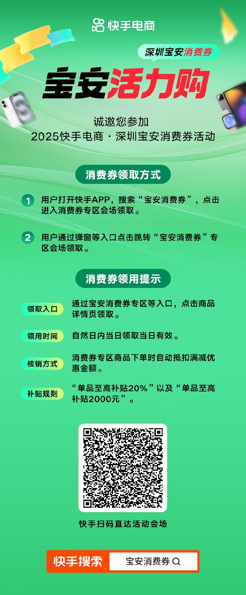 量身打造“数字化消费新场景”,宝安区商务局联手快手电商,依托平台技术和资源,11月10日正式开启2025年宝安区“宝安活力购”网络电子消费券活动,活动设置宝安优品专区,通过快手站内外传播和达人资源推广宝安优品走向全国,更涵盖大众数码消费产品、运动鞋服用品、品牌服饰、家具家电、厨房卫浴、酒水食品、个护美妆等消费品,满足消费者换季焕新的多元消费需求,通过平台立减、满减券、比例券等形式,让消费者以更直观、更便捷的方式享受补贴,真正实现“好物平价、焕新生活”。