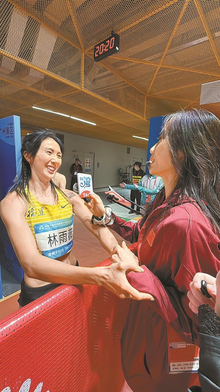 她“抓到”的第一位采访对象,是福建队短跑选手林雨薇。林雨薇看到面前站着的是曾蕊时,直接愣了一下,“没认出来”成了她的第一句反应,引得周围一阵轻笑。适应了身份变化后,曾蕊便自然进入采访节奏,先询问比赛感受,又在听到林雨薇担心成绩判定时第一时间安慰对方,两人还相约未来目标是一起站上最高领奖台。