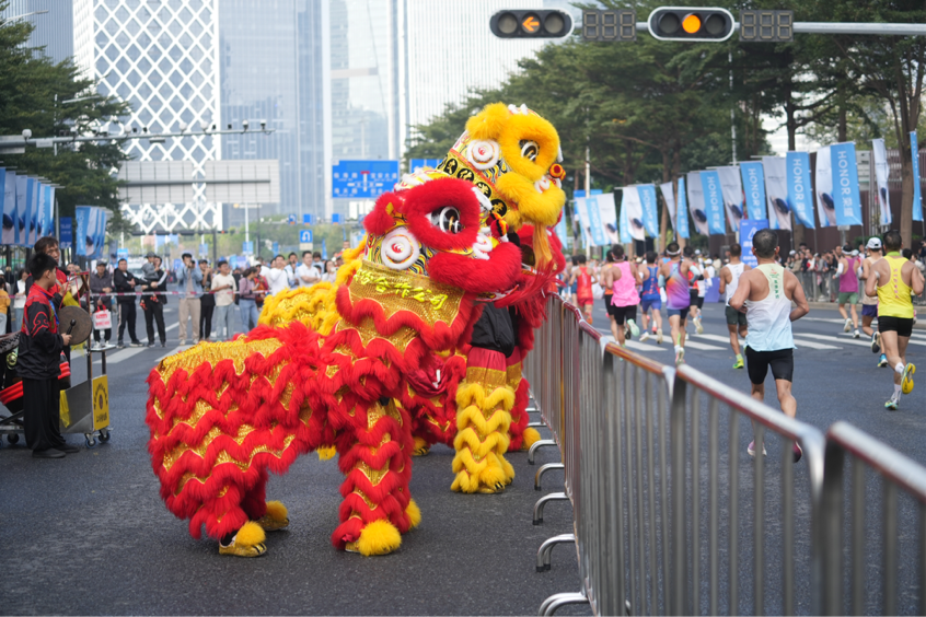 在海秀路与兴华一路交会处,震天的锣鼓声此起彼伏,宝安上川黄连胜醒狮武术团带来的国家级非遗黄连胜醒狮舞,正以最传统的礼仪迎接勇士到来。6头地狮在路口腾挪跳跃,不时与跑者、观众互动,每一次昂首、每一次眨眼,都引发围观人群的阵阵喝彩,也将现场气氛推向了高潮。