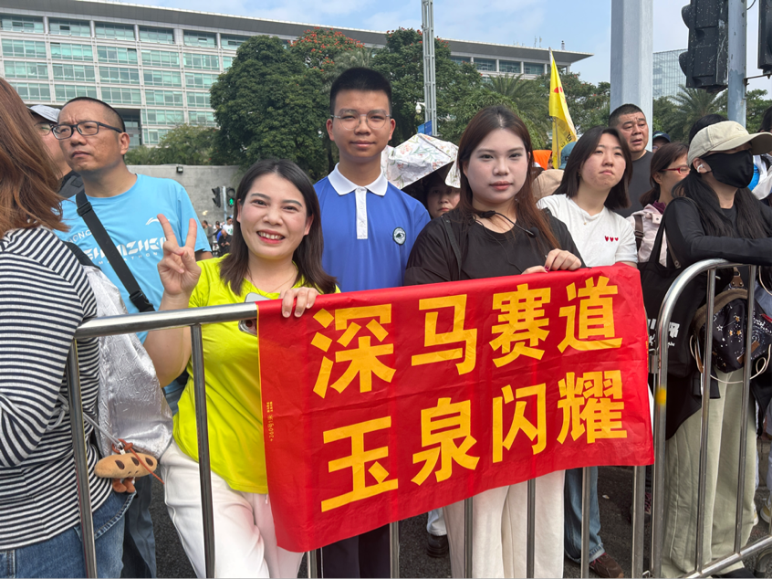 终点拱门附近熙攘的人群中,一条写着“深马赛道,玉泉闪耀”的红色横幅引人注目。这是来自宝安沙井的莫女士一家特意为丈夫张玉泉定制的专属应援。“这是他第一次跑全马。他跑步三年了,一直坚持在福永立新湖训练,非常刻苦。”莫女士眼神中满是骄傲与期待。为了迎接丈夫冲线,一家人早早从沙井赶来。莫女士感慨道:“来深圳20年了,我觉得深圳是一座非常年轻、充满活力的城市。无论是赛道的设置还是人文关怀,都做得非常棒。作为宝安人,我很欢迎全国各地的跑者都来参与深马。”