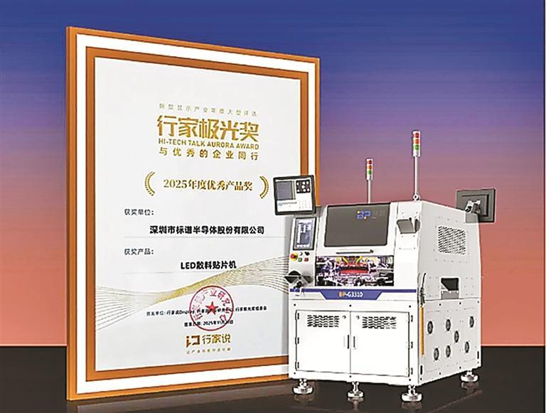 近日,由行家说Display主办的“新型显示全产业链年会暨行家极光奖颁奖典礼”在深圳举行。会上众多行业专家、产业领袖及产业链上下游伙伴齐聚一堂共探行业前沿,同时对LED产业里的杰出代表进行表彰。深圳市标谱半导体股份有限公司(以下简称“标谱”)自主研发的LED散料贴片机凭借其高效、精准、创新的自动化贴装方案,成功斩获行家极光奖2025年度优秀产品奖,彰显硬核品牌实力。