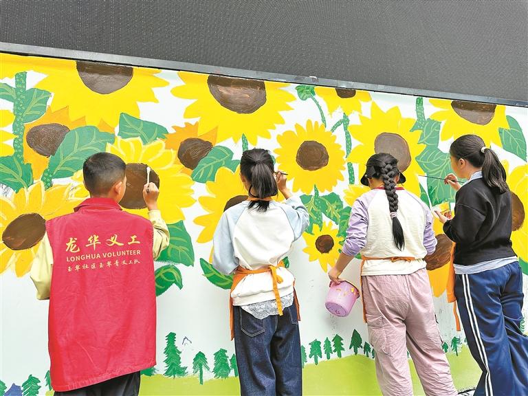 项目落地阶段,该社区整合多方资源组建创作联盟。龙华区罗常谨美术公益老师团队负责核心设计,辖区绘画教培机构骨干现场指导,亲子志愿者、幼儿园师生踊跃参与,共同执笔绘就美景。如今,崭新的向日葵墙绘不仅美化了社区环境,更成为居民休闲打卡好去处。