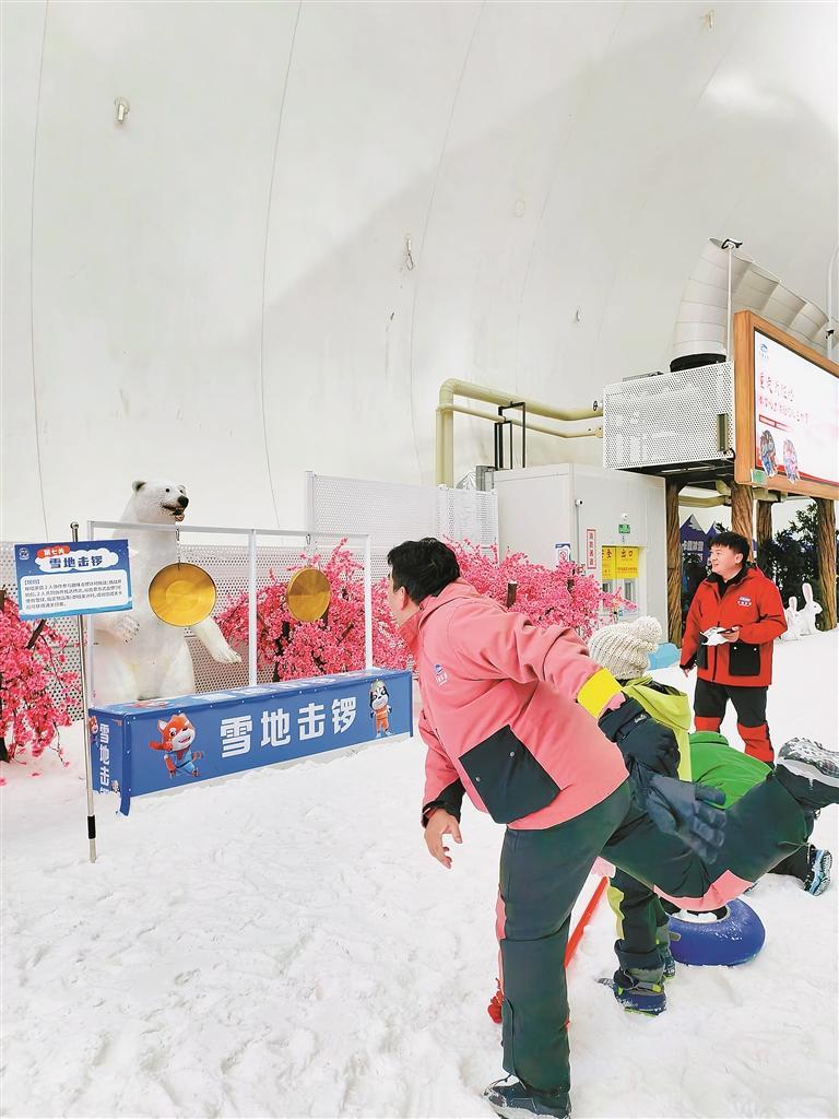 为让更多人感受在“家门口”畅玩冰雪的乐趣,卡鲁冰雪世界推出“雪地亲子挑战赛”,开启了一个月的冰雪狂欢之旅。挑战赛设置雪圈飘移、雪地接力、极光寻宝、雪地二人三足、真冰冰壶、活力冰滑梯、终点击锣七大游戏关卡,趣味性满满。“我们的闯关规则是,一大一小2人组队,在1小时内完成7个闯关项目,用时越短排名越靠前。”据卡鲁冰雪世界相关负责人介绍,闯关结束后,亲子可继续畅玩娱雪区项目,无论是堆雪人还是打雪仗,都能给孩子留下一个最美好的冰雪回忆。