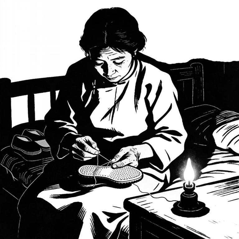母亲右手持针,左手握着厚厚的鞋底,一针扎下去,需要用顶针死死顶住,然后咬着牙,猛地将针从另一面拔出来,麻绳穿过布层,发出“嗤”的一声。有时针钝了,扎不透,她便自然地捏起针,在那满是乌黑的鬓角里轻轻一划,仿佛给针注入了灵魂,再扎下去,便顺当了许多。一晚上,两三个小时,也不过能纳完小半只鞋底。