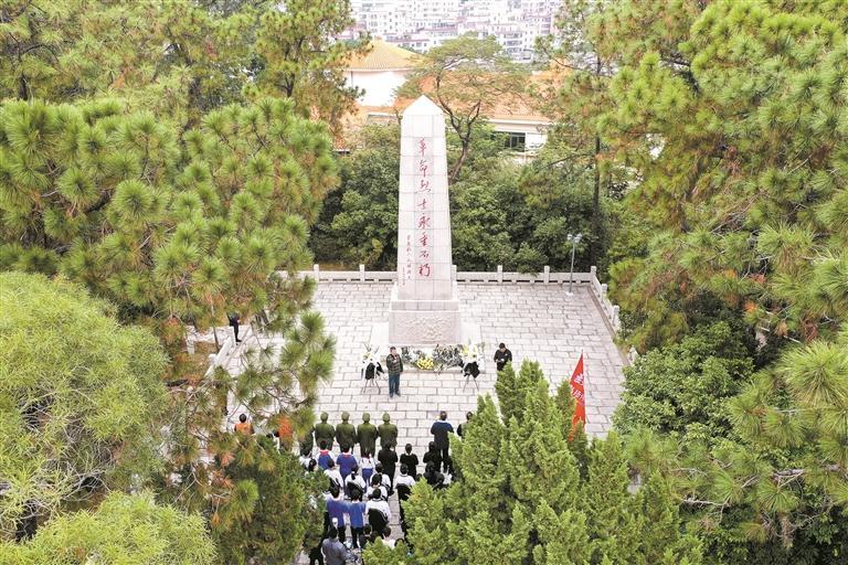 深圳龙华公园内,革命烈士纪念碑巍峨矗立,阳光穿过苍松翠柏,洒在碑旁两座紧挨着的墓冢上。墓碑朝向西,目光所及正是层峦叠嶂的阳台山。