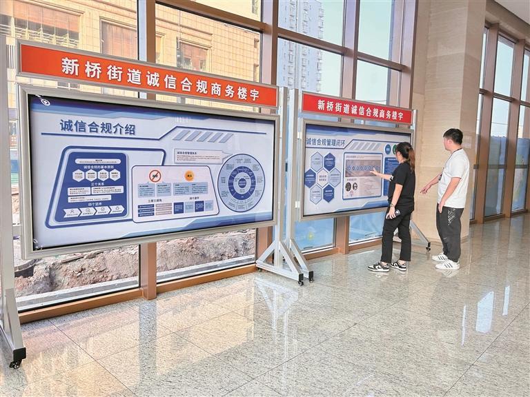 新桥街道的35栋商务楼宇正焕发全新治理活力:凭借“诚信示范楼宇”培育工程,织就一张政府引导、企业履约、群众守信的多元治理网络。该街道于2023年对楼宇信用治理模式进行全面升级——通过打造“1+3+N”信用品牌工程,引导楼宇业主、物业服务方、入驻企业三方形成治理合力,将诚信经营理念深度融入每栋楼宇的运营与发展“血脉”。