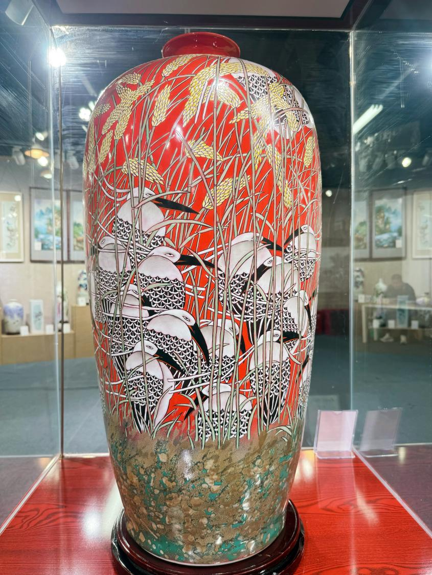 近日,2026深圳首届中国百年名人陶瓷精品绝品展在深圳市宝安区海格堡购物中心开幕,让观众近距离感受陶瓷艺术融入日常生活的独特魅力,真正实现“让国粹走进生活、让文化浸润人心”。作为白金汉宫收藏的仅有的两件中国当代陶瓷作品之一,《岁岁和合》承载着深厚的文化底蕴与艺术价值。作品以标志性“宁钢红”为底色,金黄稻穗交织亭亭荷花,仙鹤悠然栖息其间,稻穗寓意“岁岁”,荷花与仙鹤象征“和合”,巧妙融合成“岁岁和合”的吉祥寓意,寄托着家庭和睦、社会和谐的美好祈愿。工艺上,作品创新融合高温色釉与传统粉彩技法,经1320度高温烧制而成,釉色温润流转,笔触细腻生动,完美诠释了宁钢“法于传统,而不囿于传统”的艺术理念。