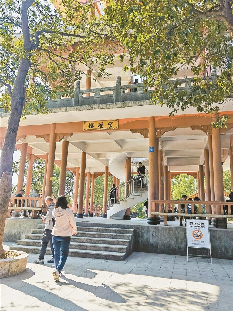 山脊的台阶边,绿树成荫,间有巨石作伴,约40分钟,便来到凤凰山制高点——鲲鹏径第一段高峰。这里海拔376米,建有一座风格古朴典雅的四层高亭阁,名为“望烟楼”。拾级而上,登楼远眺,元朝古人文应麟的故事浮现在脑际。
