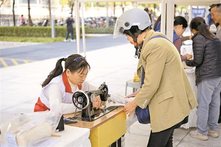 志愿者为居民缝补衣物。