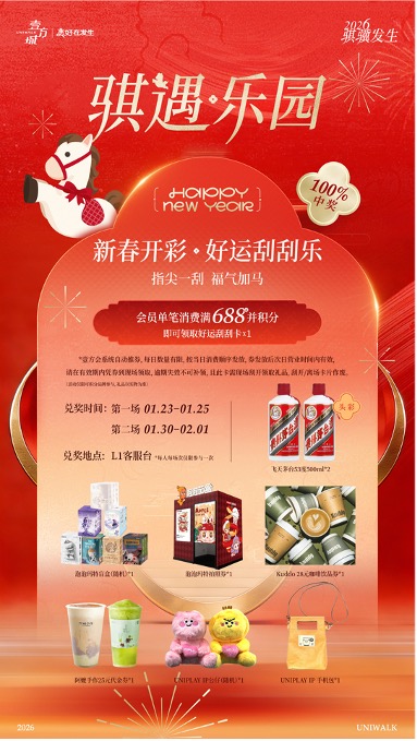 旧年暖意未散,新春序曲已奏响。1月25日起,前海壹方城“骐遇乐园”全国首展正式启幕,300平方米沉浸式新春主题空间带来别样年味:“乐马”化身新春使者,串联非遗表演、超级大变装、巨型机甲、品牌快闪与超值福利,打造集文化体验、潮流打卡、购物狂欢于一体的新春盛会,邀大家共赴2026“骐骥”新岁之约。