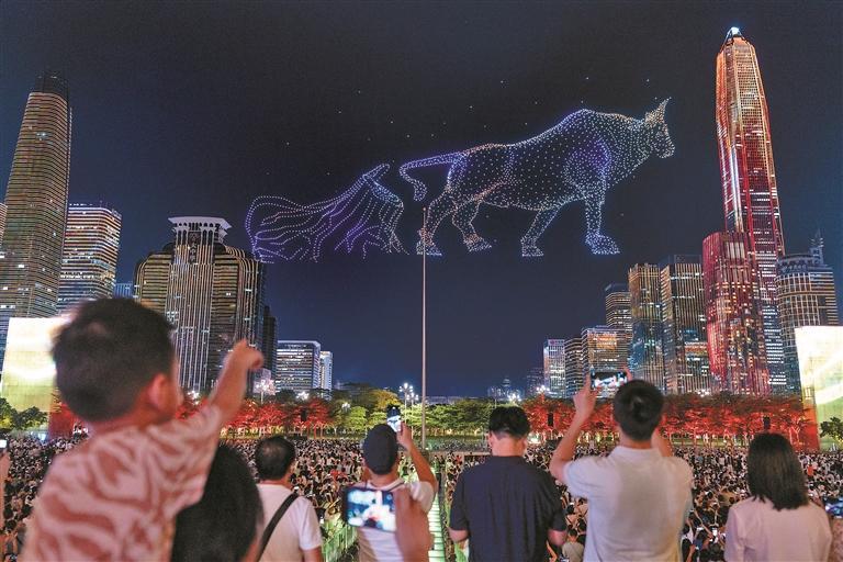 ▲深圳经济特区建立45周年无人机灯光秀现场,龙华企业大漠大的无人机闪耀夜空。