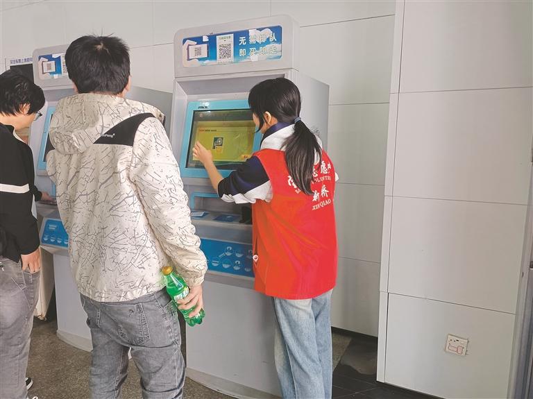 在售票厅与自助取票机前,面对操作不便、不熟悉的旅客,志愿者主动上前,耐心指导或代为操作购票、取票,用温和的话语和贴心的服务,为旅客化解窘迫。