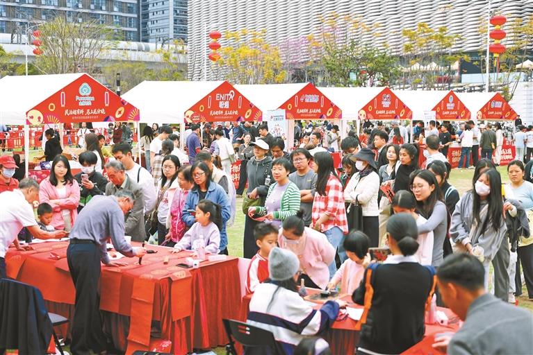 活动现场,文化公益区始终洋溢着温馨氛围。书法家现场挥毫泼墨,一副副寓意吉祥的春联和“福”字在笔尖诞生。开心麻花红山剧场也为市民的春节增添了文化韵味,现场免费发放观剧卡,将欢笑与艺术送到居民手中,丰富春节期间的文化娱乐选择。“民治超有料”互动问答区更是成为居民展示家园自豪感的舞台。“民治目前有3条地铁线,在建的还有好几条!”“民治的口号是‘智创民治、中心之城’!”一个个准确答案脱口而出,答对者喜获纪念品。