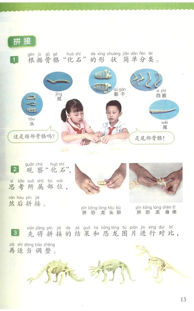 为此,试教团队把新教材研读了好几遍,并根据杜伟老师推荐,从头到尾认真读完《恐龙从远古走来》、《恐龙绝响》这两本书,然后深刻反思恐龙分类识别、挖掘恐龙化石、骨骼如何拼接、复原恐龙、制作微缩恐龙乐园等各课时,究竟想让孩子们搞懂什么,再据此来设计教学环节、优化教学方法。