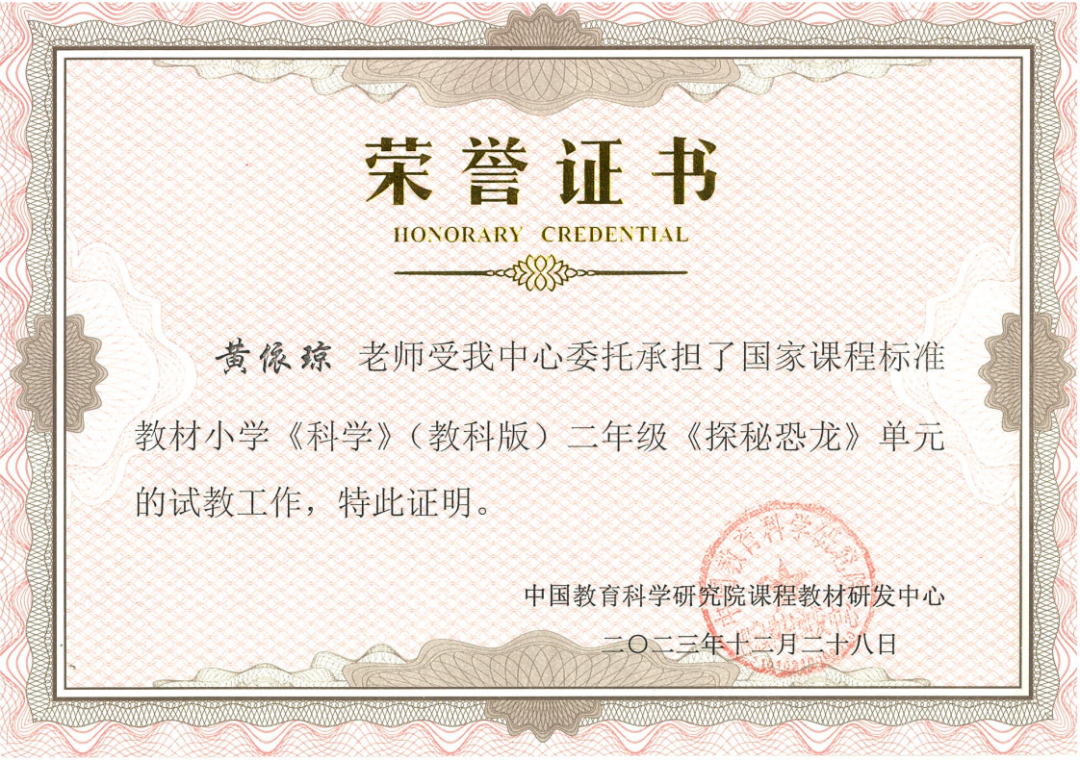 记者进一步了解到,全国新版小学《科学》教材(教科版)二年级下册第一单元《探秘恐龙》的实验操作和学生配图,都是出自黄田实验学校科学老师杨丹婷之手。