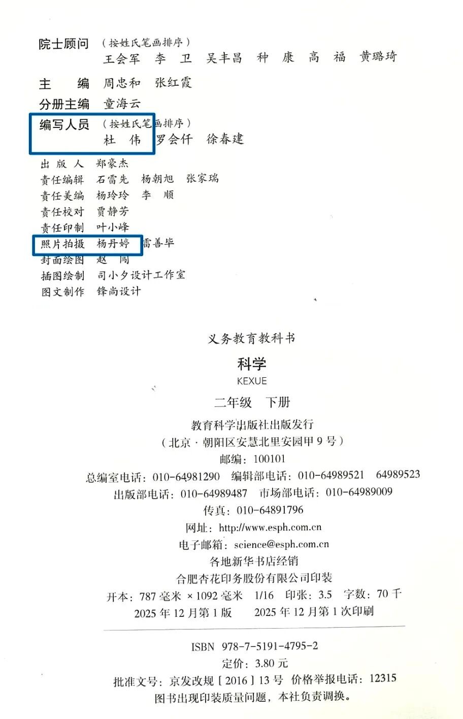 作为6名入选学生的代表之一,现已就读四年级的胡望雅同学,心中难掩激动:“能参与新教材配图拍摄,我感到特别荣幸和骄傲。在参与拍摄时我就发现,新教材内容更生动有趣,每一页都藏着科学小秘密。”当得知这本新教材可能还要用十年后,她更是喜不自禁,“我妹妹现在上幼儿园中班,那再过3年她就能用上这本教材了,希望到时候她能惊喜地发现,上面这个人居然是我——她的姐姐。”