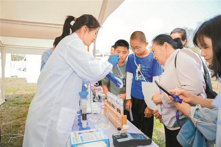 互动科普体验区是当天的“流量担当”,在水质酸碱度测试、水力发电等实操实验台前,围满了跃跃欲试的小朋友。