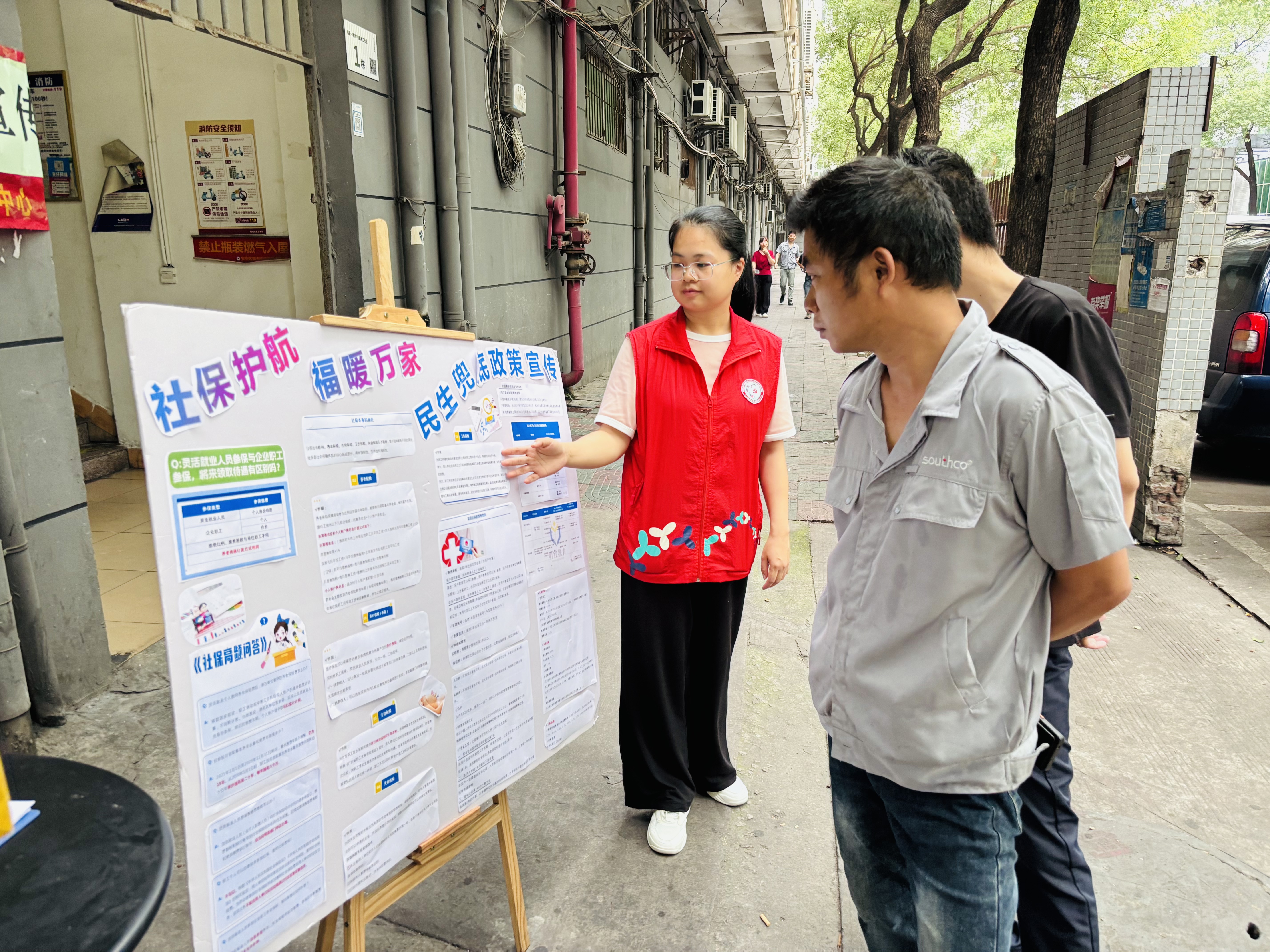 5月16日,在福海街道展城社区党委的指导下,旭源社工在鹏洲工业园开展“社保护航·福暖万家——展城社区民生兜底政策宣传活动”,吸引了社区居民60余人参与,取得了显著成效。