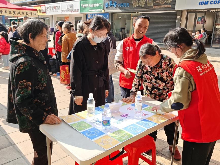 活动现场设置三大互动摊位:“石头剪刀布挑战”通过趣味手势游戏锻炼反应能力;“养生口诀记忆”帮助居民轻松掌握日常健康小贴士;“政策拼图”则将民生政策转化为直观易懂的图文模块,居民在拼图过程中便能了解高龄津贴、长者饭堂、居家养老等政策内容。社工与志愿者通过海报展示、现场讲解等形式,将健康养生知识与复杂的政策内容变得通俗易懂、贴近生活。不少居民表示,这种“边玩边学”的方式既有趣又实用,让他们更容易记住健康知识和政策信息。