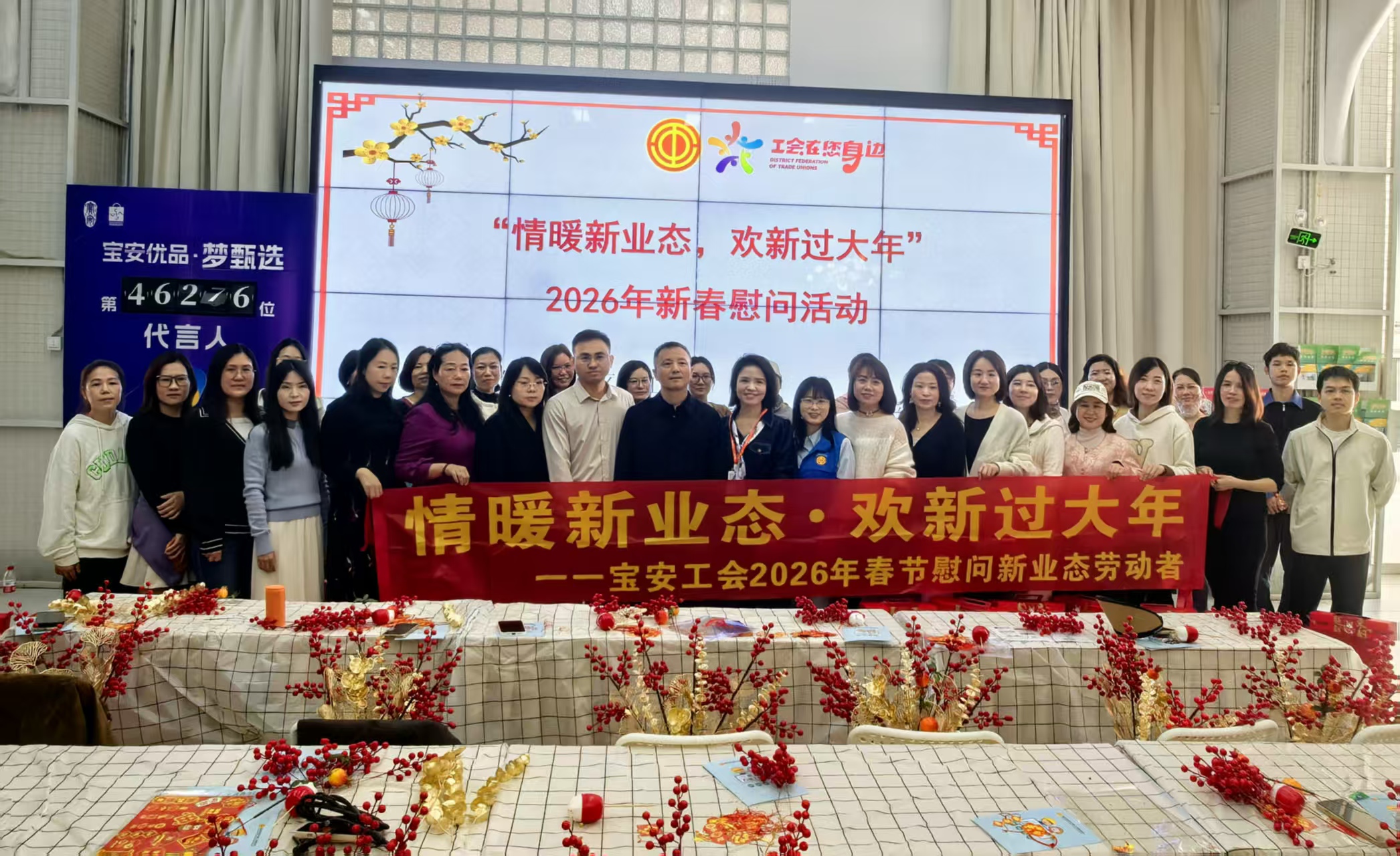 1月27日下午,宝安区总工会、福永街道总工会、万福工联会在智美·汇智产业园区开展“情暖新业态·欢新过大年”2026年春节慰问活动,向辖区电商服务人员、外卖员等新业态劳动者送上新春祝福与关爱礼包,惠及新业态劳动者130名。