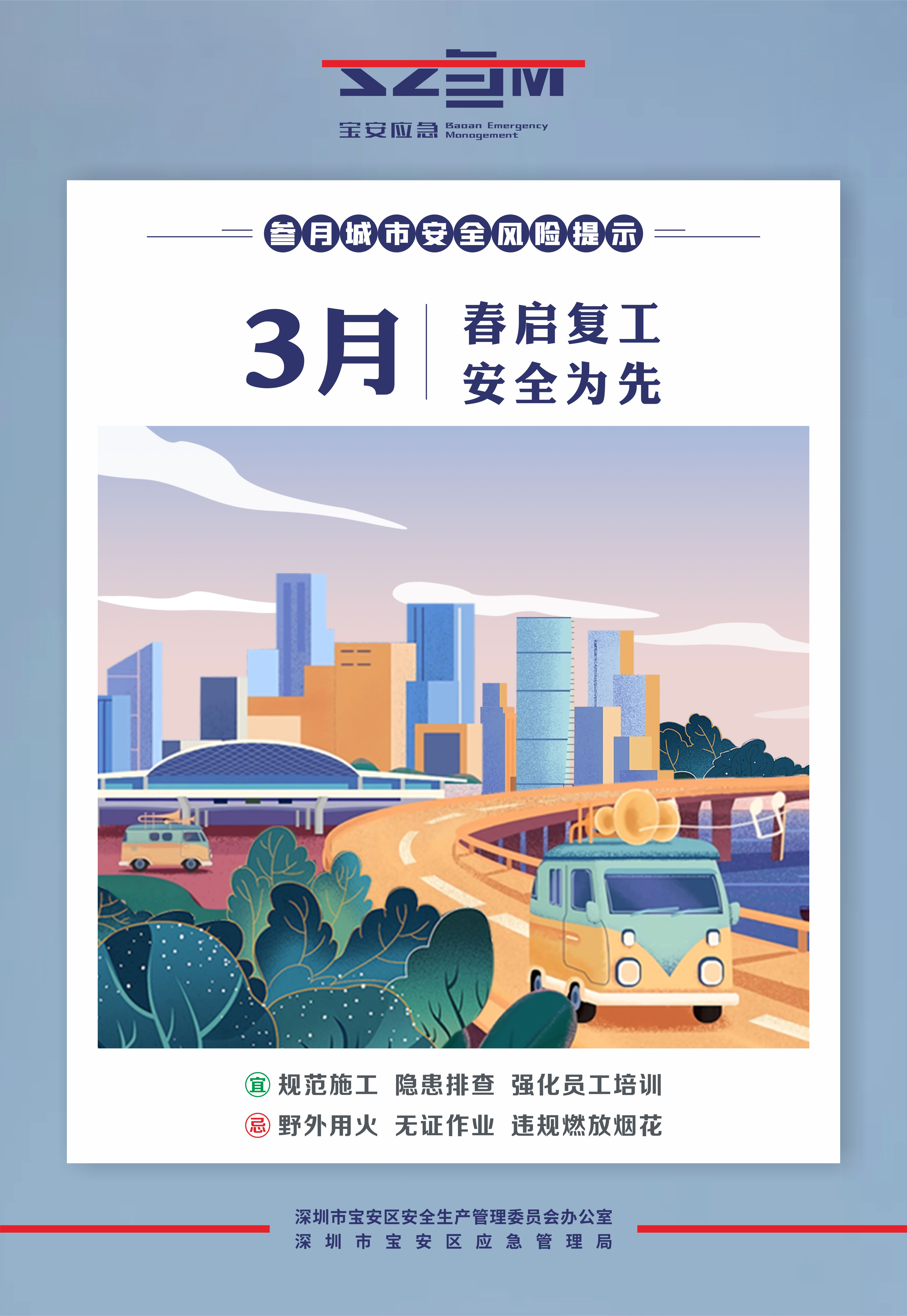 3月,全区生产经营活动全面恢复,限额以下小型工程、零星作业逐渐进入施工高峰,市民踏青活动增多,各类安全风险交织叠加。为保障城市安全,宝安区应急管理局发出3月份城市安全风险提示,提醒生产经营单位和市民朋友提高安全意识,重点关注和防范以下城市安全风险:
